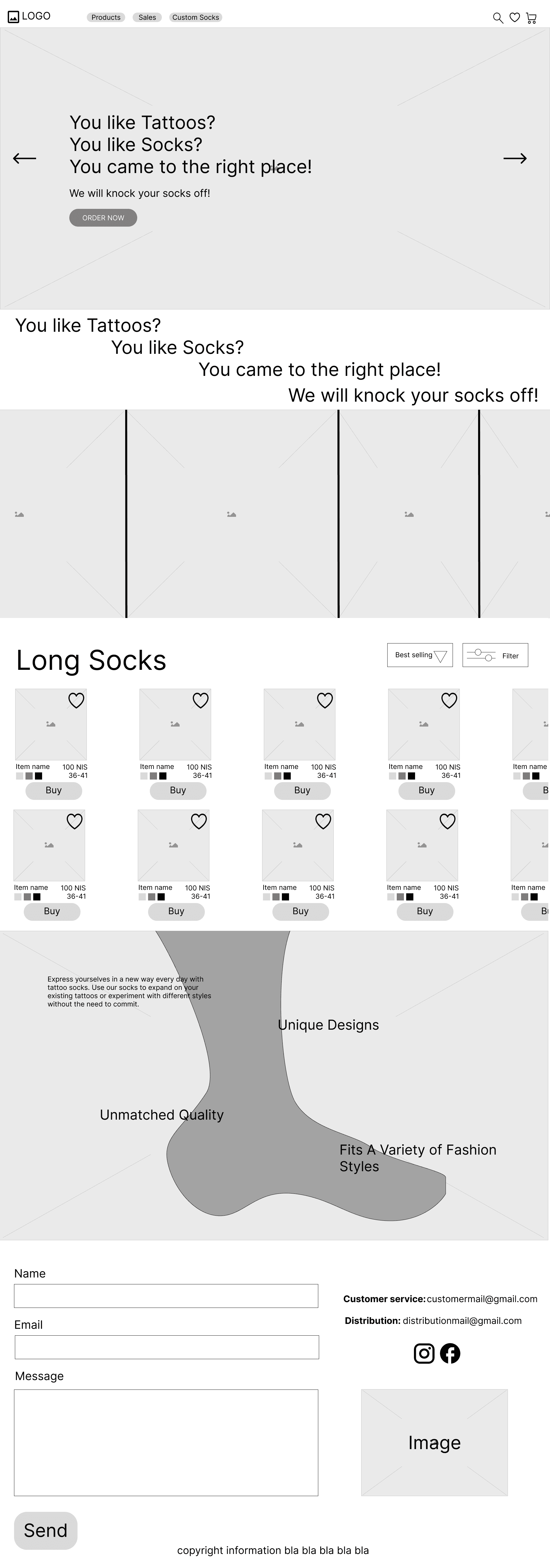 Tattoo Socks is an online sock shop for tattoo lovers which was created as a one page website. The socks are created as tattoos that you can switch every day. The design was made for the final group project for a web design course in Wizo in which we had to create an online shop for socks of our choice.