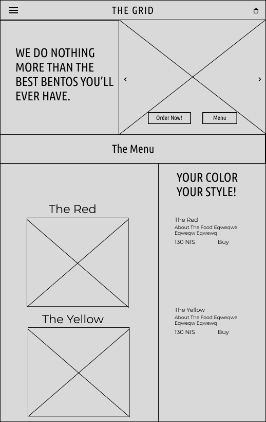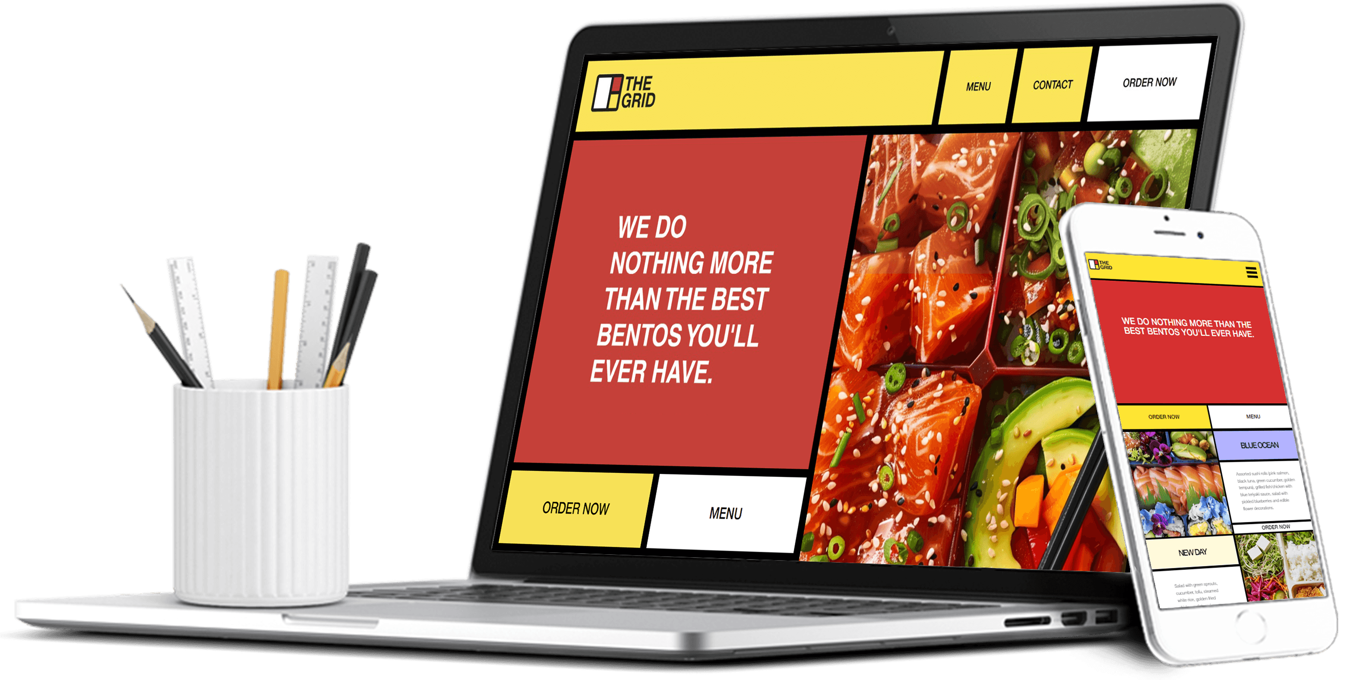 The Grid is a bento restaurant inspired by the works of Piet Mondrian. The website is a one-pager which includes a menu, about, and contact section, as well as a link to an order popup.